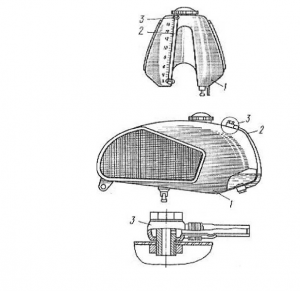 У мотоцикла нет указателя уровня топлива. Конечно, со временем владелец приобретает опыт, и привыкает на глаз определять более или менее точно, сколько топлива в баке. Однако можно пользоваться точными (см. рисунок) данными. Для этого надо дооборудовать топливный бак 1 простейшей мерной трубкой 2} действующей по принципу сообщающихся сосудов.