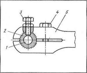 Для закрепления разболтавшегося пускового рычага (кик-стартера) или педали переключения передач на мотоцикле применяют разные способы.Предлагается еще один способ, опробованный на мотоцикле Минского завода. Отметив взаимное положение вала 2 и пускового рычага 5, надо снять их, просверлить отверстие, нарезать резьбу М6 и ввернуть болт 3 со стопорной гайкой, как показано на рисунке (конец болта не должен касаться вала 1 механизма переключения передач). После нескольких лет эксплуатации соединение не ослабевает.