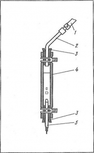 На рисунке обозначено: 1 —шланг насоса; 2 — трубка (штуцер от камеры грузового автомобиля); 3 — уплотняющая трубка, разрезанная вдоль; 4 — шланг диаметром около 20 мм; 5 — трос.