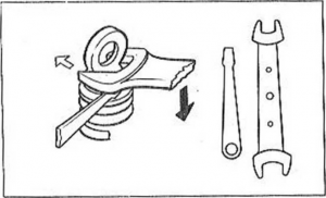 При разборке заднего амортизатора у мотоциклов требуется сжать пружину, чтобы извлечь стопорные полукольца (сухари). Для этого применяют множество разных приспособлений и способов. Владельцам мотоциклов ИЖ предлагается еще один способ, простой и доступный. Открытый гаечный ключ (например, 24X36, входящий в штатный набор инструментов) надо подвести под верхнюю проушину амортизатора и нажать на лезвие отвертки, опирающейся на одно полукольцо, пока не освободится другое (как показано на рисунке). Затем полукольцо нужно снять. Таким же образом сжимается пружина в том месте где стояло первое полукольцо, и удаляется второе.