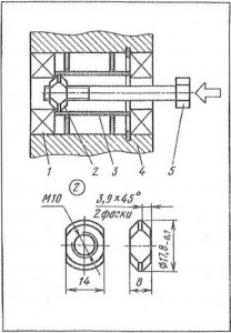 Для того чтобы исключить эти нежелательные последствия, полезно изготовить специальную оправку 2, показанную на рисунке (размеры даны для мотоциклов ИЖ), пользоваться которой удобно и безопасно. На рисунке обозначено так же 3- распорная втулка, 5- болт м10х120