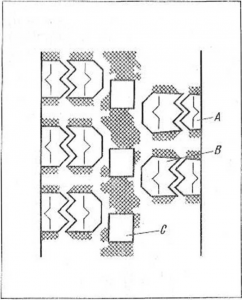 Проходимость мотоцикла во многом зависит’от шин, точнее—от рисунка протектора. К сожалению, специальные шины купить невозможно, поэтому предлагается сделать их из обычных шин мод. К 102 размером 3,50—18 мотоцикла ИЖ. Для этого нужен только острый нож, которым надо срезать части выступов на протекторе (на рисунке они заштрихованы) в порядке А, В, С (т. е. от края к середине) для удобства работы.